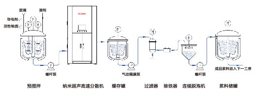 剪切冲击容器的内壁,并且在静止的容器内壁与高速旋转的分散器之间形成薄膜状紊流分散层。薄膜状紊流分散层中的动力电池浆料在高剪切力作用下发生剧烈的碰撞、摩擦从而使团聚体得以快速分散。高速分散后的动力电池浆料流出分散装置,进入超声波装置照射产生的谐振破坏冲击力(微小气泡)使浆料进一步纳米分散,从而进入超声波装置照射产生的谐振破坏冲击力(微小气泡)使浆料进一步纳米分散 ,从而确保流体分散品质的一致性及提高生产效率。